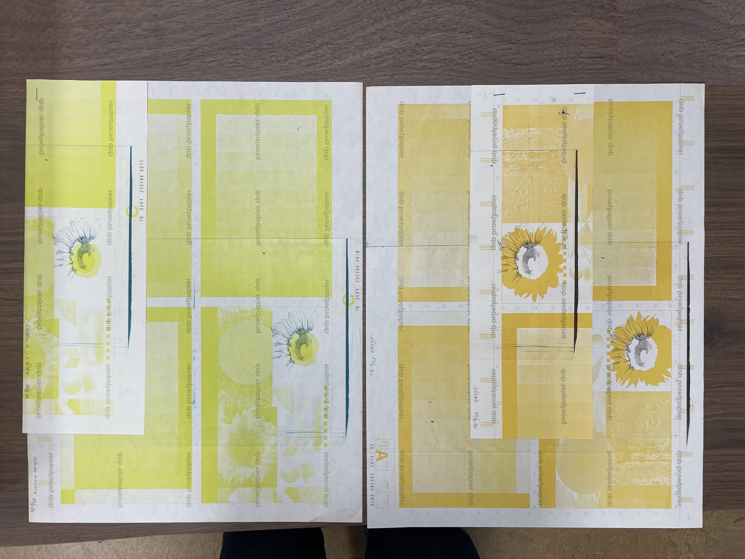 De tweede casus is het vijftig gulden biljet ontworpen door Robert Deodaat Emile (Ootje) Oxenaar, in omloop gebracht in 1982 door De Nederlandsche Bank. Hij gaf op innovatieve wijze vorm aan het biljet, wat resulteerde in een gevierd ontwerp. Allereerst de kleur. In lijn met vijftig gulden biljetten uit het verleden, met als meest bekende het ‘geeltje’ uit 1862, werd geel als hoofdkleur gekozen.[vi] Uit later onderzoek van DNB blijkt dat mensen kleur een belangrijke herkenningsfactor vinden, iets wat voor Oxenaar voorop stond en waarvoor hij zich liet inspireren door de kleurrijke Monopoly biljetten.[vii] Uit de proefdrukken die te vinden zijn in het archief van het Allard Pierson is een zoektocht naar de juiste kleur te herleiden. In de laatste twee weken van september 1980 worden aanvankelijk bonte kleurcombinaties uitgeprobeerd, gevolgd door geel-roze experimenten, om uit te komen bij een helder geel die later met druklagen groen en oranje wordt gefundeerd. Ook het motief van de voor iedereen herkenbare zonnebloem wordt zichtbaar geïsoleerd uit een gezelschap van een taart, een banaan, een neonbord en een uitgebloeide paardenbloem.[viii] Dit element uit de natuur met de speelse toevoeging van de bij ligt in lijn met Oxenaars objectieve doch persoonlijke oeuvre, en past moeiteloos binnen de ‘bankbiljet identiteit beschrijving’ van DNB.[ix] Geld wordt namelijk actief ingezet om een gevoel van groepsidentiteit bij de bevolking te stimuleren wat met dit ontwerp, zonder de gebruikelijke iconografie van natiepersonificaties, zeer geslaagd is. De receptie van het biljet was na enige twijfel over de herkenbaarheid van de zonnebloem als Nederlands symbool overtuigend positief, en ook na de introductie van de euro identificeerden Nederlanders zich nog altijd meer met deze serie gulden ontwerpen.[x] Het succes van de door Oxenaar gekozen beeldelementen zit in de innovatie. De Zonnebloem was het eerste biljet in Nederland met een verticale oriëntatie en de tweede in Europa met een afbeelding die geen portret of persoonsverbeelding is (de eerste was de door hem vormgegeven ‘Snip’). Oxenaar brak hiermee met de heersende gewoonte en norm in Nederland. Ook de eenduidige kleur, die met de keuze voor geel wel een prettige knipoog naar de traditie was, het prominente waardecijfer èn de identificatie van zowel de ontwerpers als de drukker op het biljet als zijnde een kunstwerk waren unieke eigenschappen.[xi] Die eigenheid maakte het voor de bevolking mogelijk het bankbiljet te zien als een voorwerp dat specifiek voor hen gemaakt was. Naast de kleur en het motief zijn de materialistische eigenschappen ten behoeve van de veiligheid door Oxenaar ook onderdeel gemaakt van het ontwerp. In nauw contact met drukker Joh. Enschedé en Zonen realiseerde hij zijn ideeën en stelde alle elementen in dienst van het totaalontwerp.[xii] De ribbelrand van donkerbruine verdikte inkt, midden onderaan de achterkant van het biljet is bijvoorbeeld niet alleen een echtheidskenmerk maar ook een interactief element. Als je met je nagel over de ribbels gaat, zo stelt de proefdruk van de folder in het archief, “...kunt U de bij horen zoemen!”.[xiii]