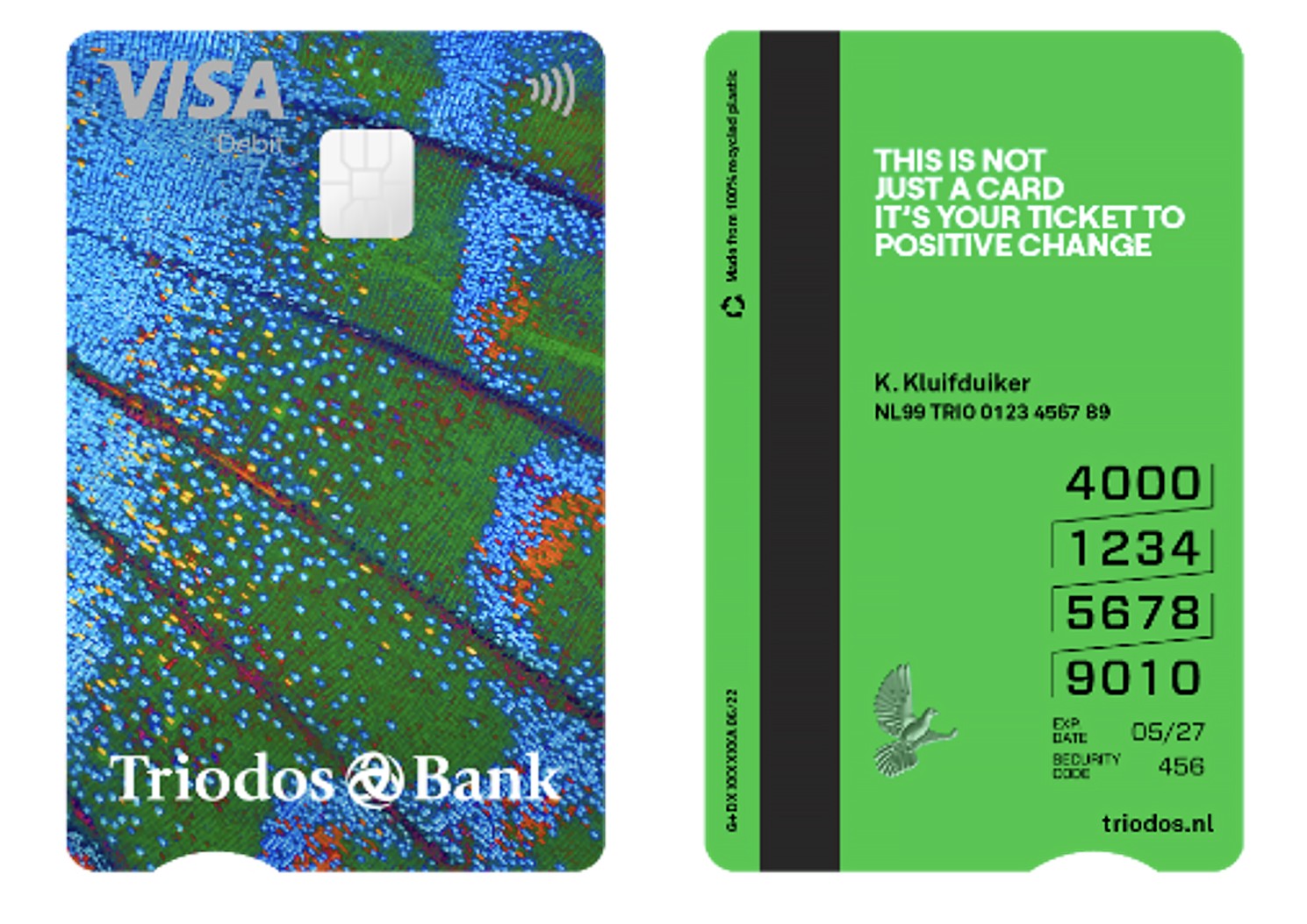 De Triodos Bank is sinds de jaren zestig uitgegroeid tot een gerenommeerde organisatie die haar idealen voor de wereld om ons heen scherp in het vizier houdt. Zo worden investeringen ingezet voor positieve maatschappelijke veranderingen op gebied van milieu, zorg en cultuur.[i] De bank staat op die manier in dienst van de idealen van de rekeninghouder, die daarnaast ook op dagelijks niveau geniet van innovatie. De Visa Debit-betaalpas die door bureau Dietwee is ontworpen is hiervan een tastbaar voorbeeld .[ii] Naast het gebruik van 100 procent gerecycled PVC worden de ideologische waarden van de bank door het grafische ontwerp overgedragen, wat waarde toevoegt aan het object. Dit maakt de fysieke betaalpas met de groeiende mogelijkheid tot mobiel betalen relevant voor bank en consument.
